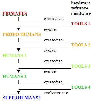 Early primates used incidental tools found in nature (such as sticks or stones) to give them artificial body parts (such as arms or fists). This gave them an advantage over animals who had only their biological arms and fists to affect their environment. That was part one of the back-and-forth action: primates → create/use → tools.